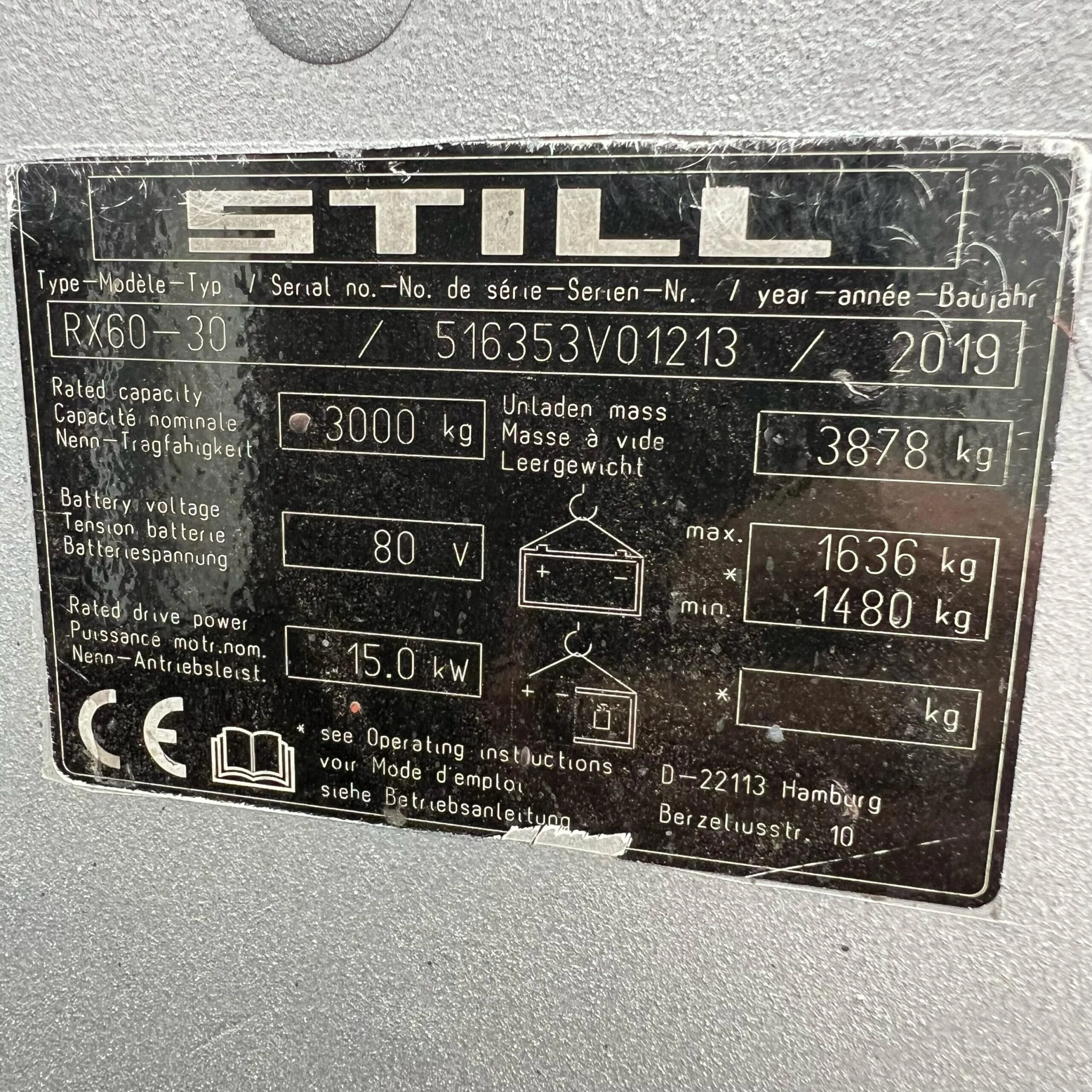 Weller Recreation is honored to present this 2019 STILL RX60-30L 4 Wheel Electric Forklift for Sale, a powerful and reliable preowned forklift with a 3-tonne capacity and a 4600mm lift height. Built for tough industrial applications, this model delivers exceptional lifting performance, enhanced operator protection, and flexible charging options — making it an ideal choice for both indoor and outdoor environments.