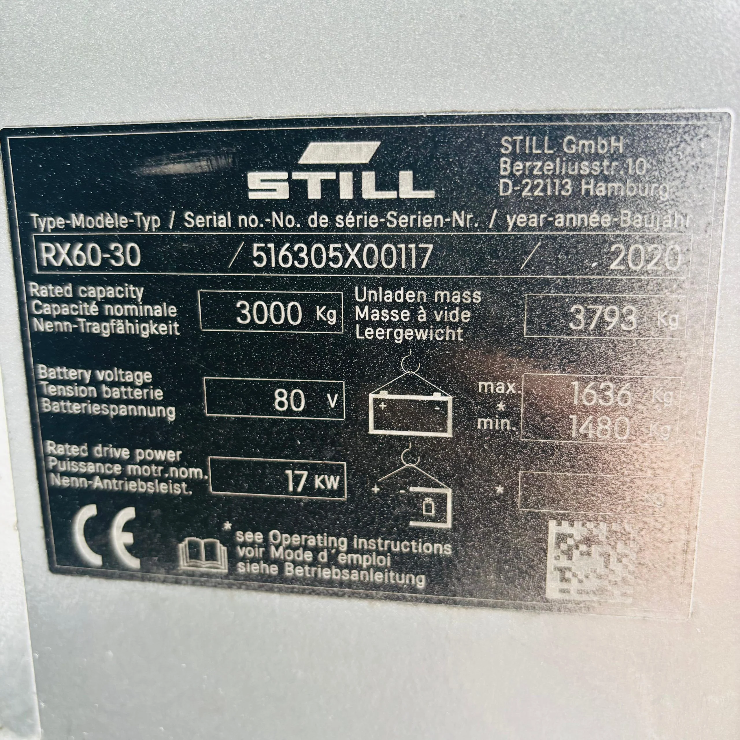 The 2019 STILL RX60-30L 4 Wheel Electric Forklift for Sale is a durable, efficient, and operator-friendly solution built to handle demanding lifting applications. With a robust 3-tonne capacity, reliable 80V power system, and excellent maneuverability, this model delivers consistent performance and low operating costs.