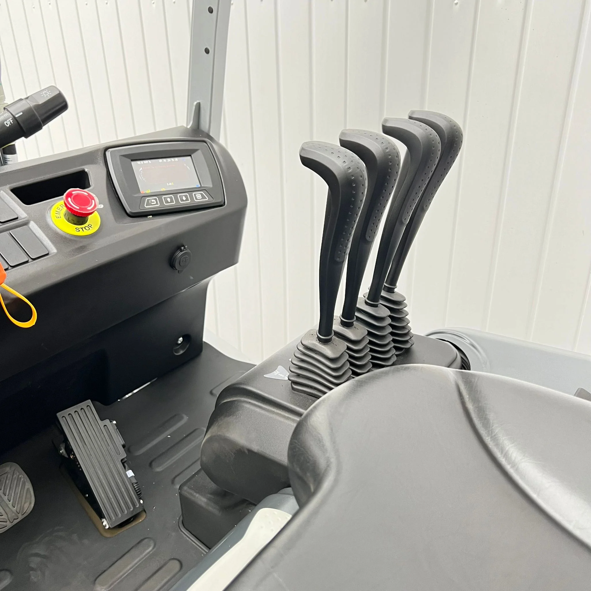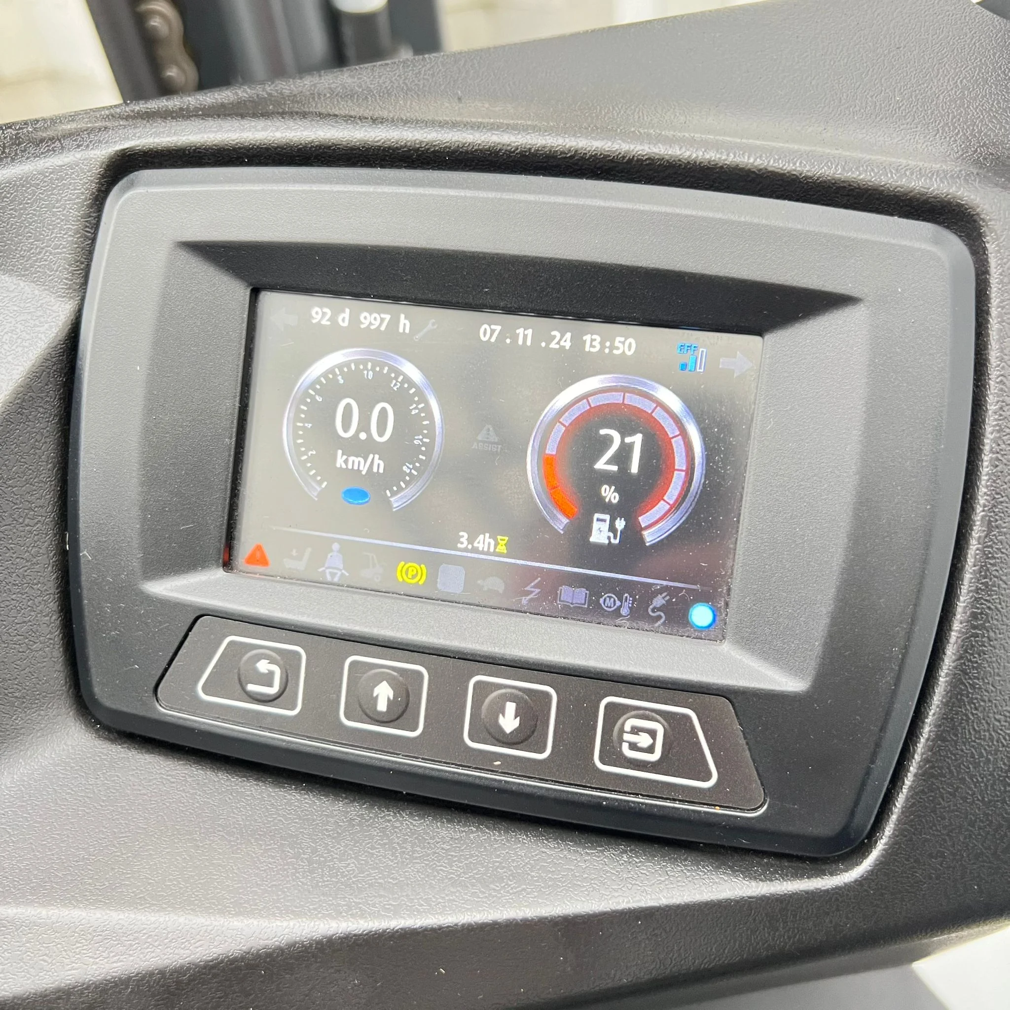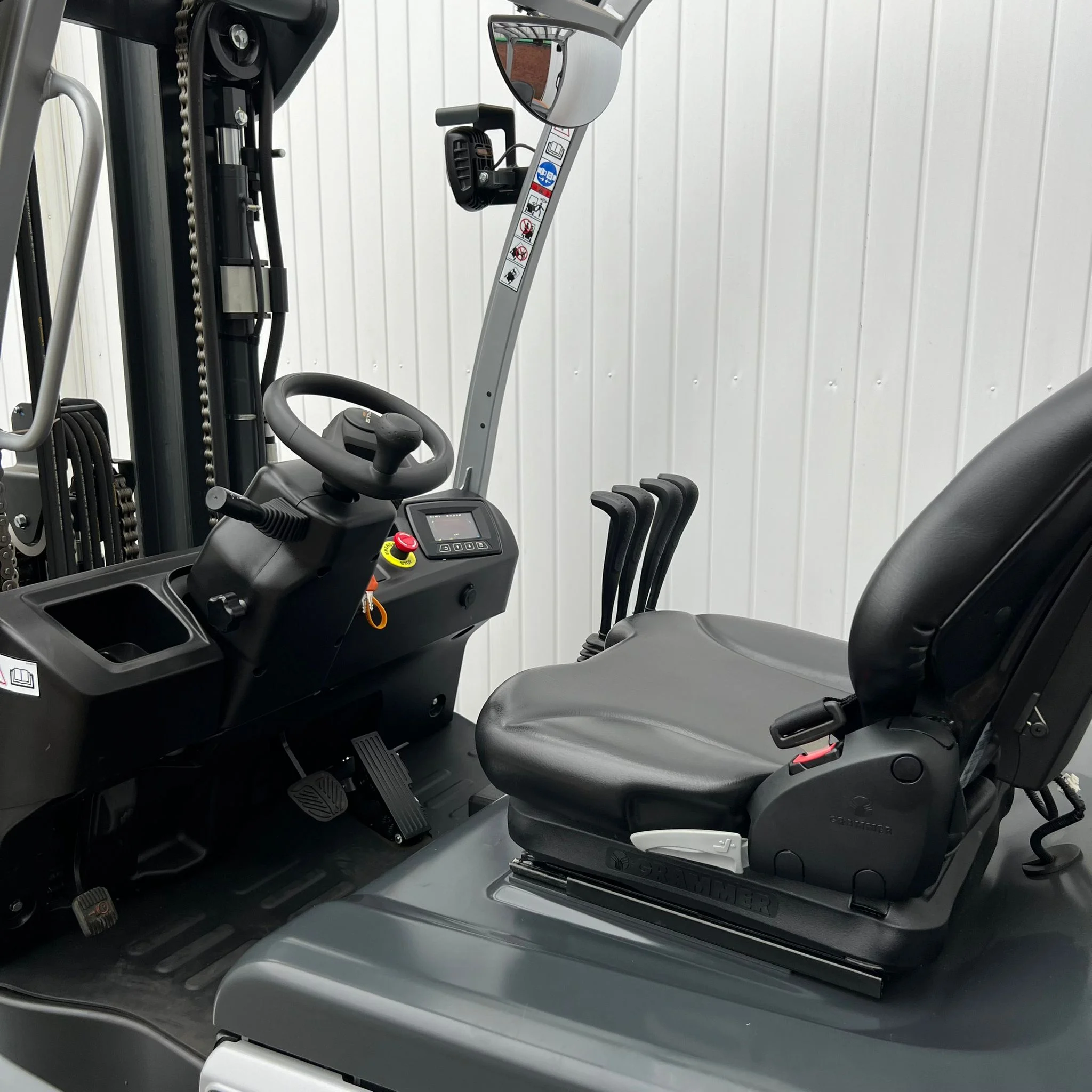 The operator’s cab is built for fatigue-free operation, featuring a non-slip rubber mat, wide entry step, and ergonomically shaped seat for optimal support. A large color display keeps critical data — including battery level, direction, and drive mode — in clear view.