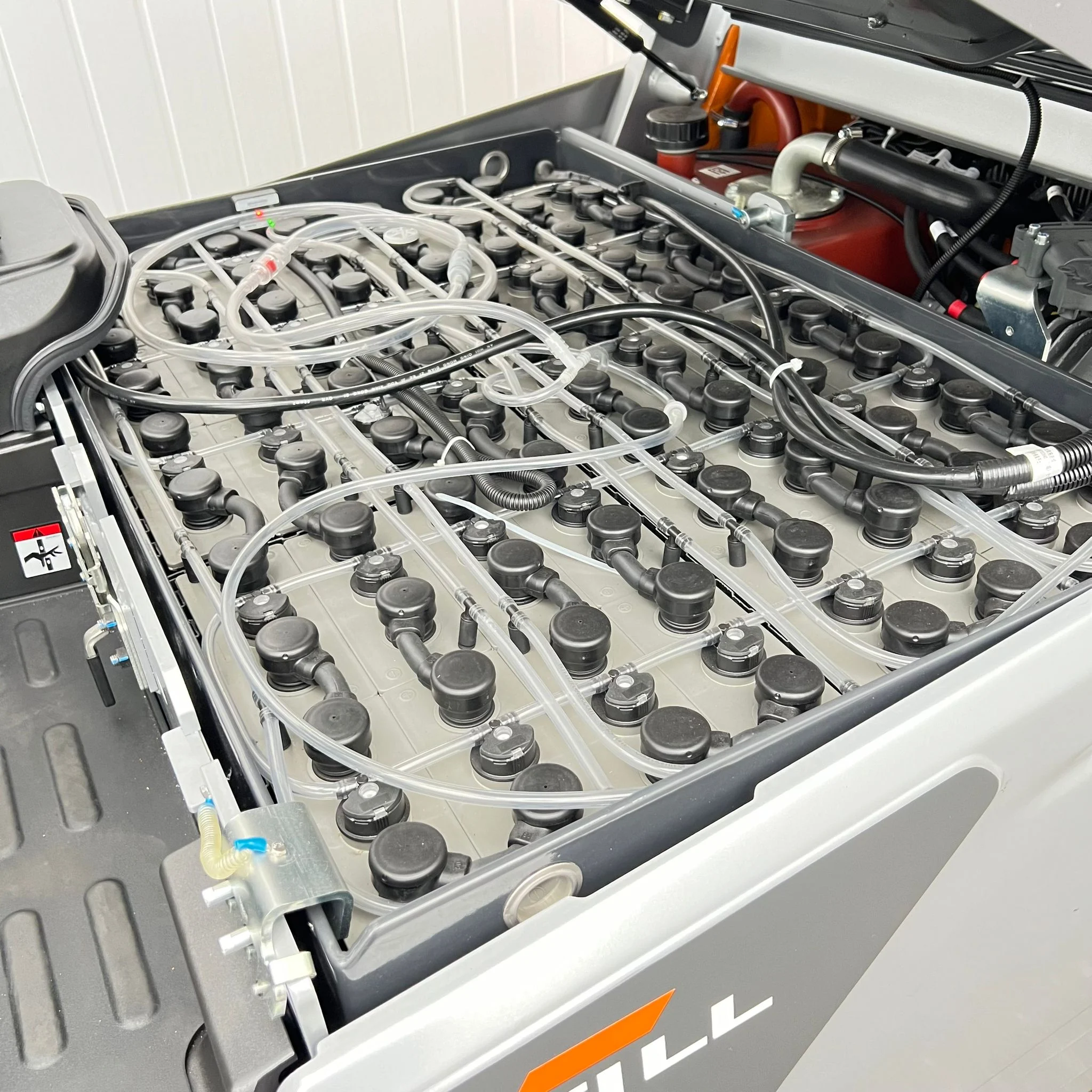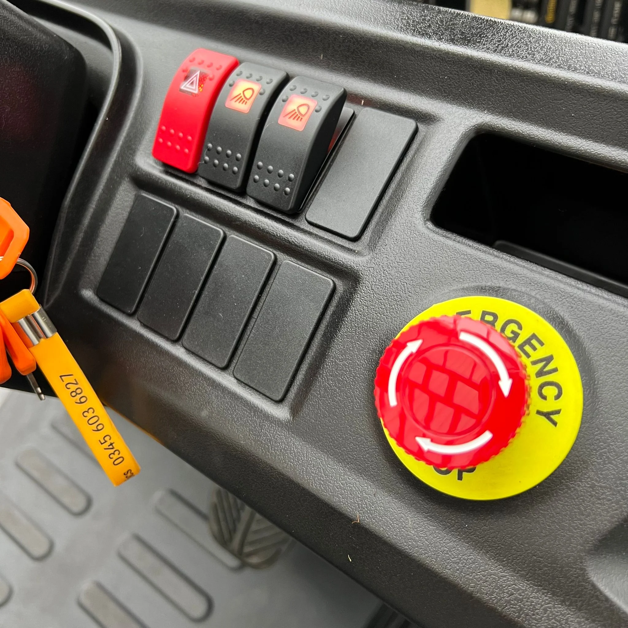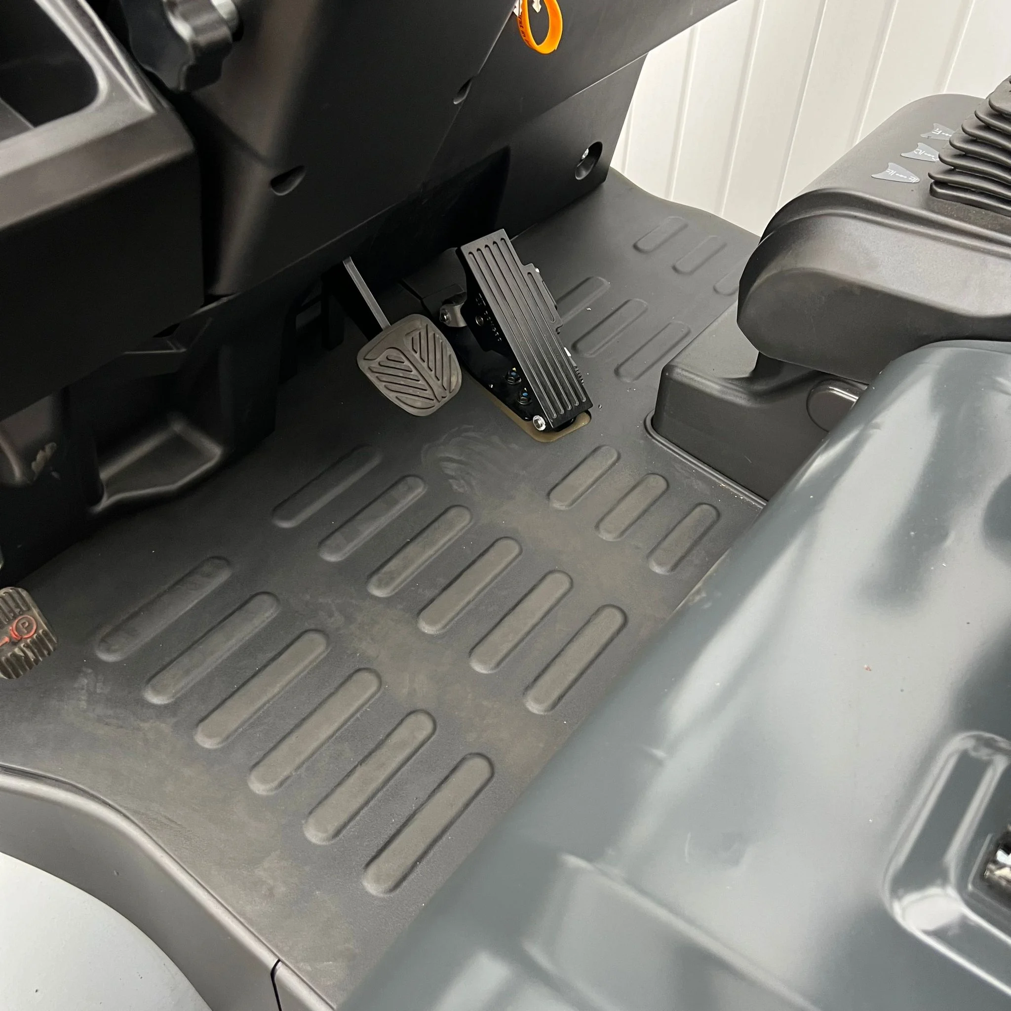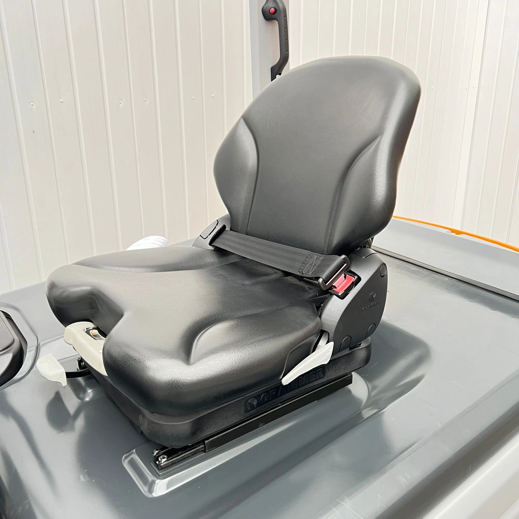 The operator’s cab is built for fatigue-free operation, featuring a non-slip rubber mat, wide entry step, and ergonomically shaped seat for optimal support. A large color display keeps critical data — including battery level, direction, and drive mode — in clear view.